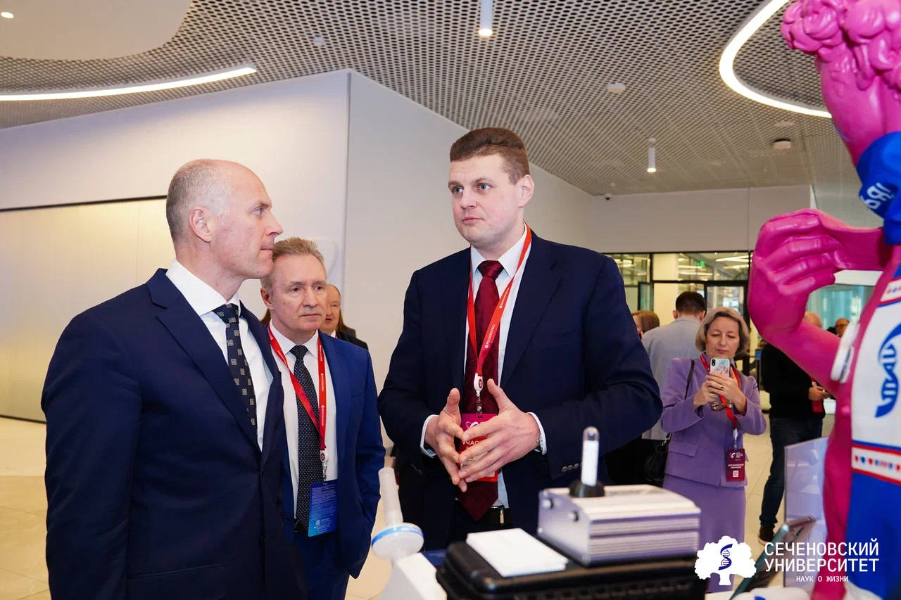 Проректор по научно-технологическому развитию Сеченовского Университета Вадим Тарасов подробно рассказал главе Минздрава о проектах, представленных на стенде. Михаил Мурашко высоко оценил разработки университета. В частности, он отметил инновационное нательное устройство «РИТМ-1», предназначенное для длительного мониторинга ЭКГ. Компактный водонепроницаемый сенсор крепится на груди и позволяет регистрировать сердечный ритм до 14 дней без подзарядки, что в разы увеличивает шансы выявления скрытых аритмий. Данные передаются врачу через мобильное приложение, при этом постоянное подключение к интернету не требуется, достаточно синхронизации несколько раз в неделю.