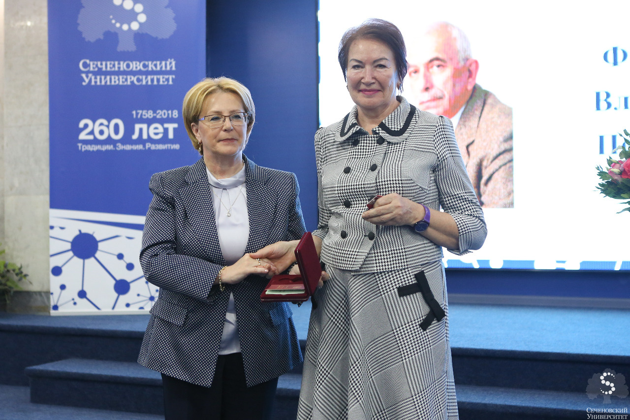 Медаль ордена «За заслуги перед Отечеством» II степени вручена завкафедрами детских болезней Наталье Геппе, фармакологии Владимиру Фисенко, медицинского права Юрию Сергееву, профессорам Марине Каневской (кафедра госпитальной терапии № 1) и Галине Смирновой (кафедра педиатрии и детских инфекционных болезней).