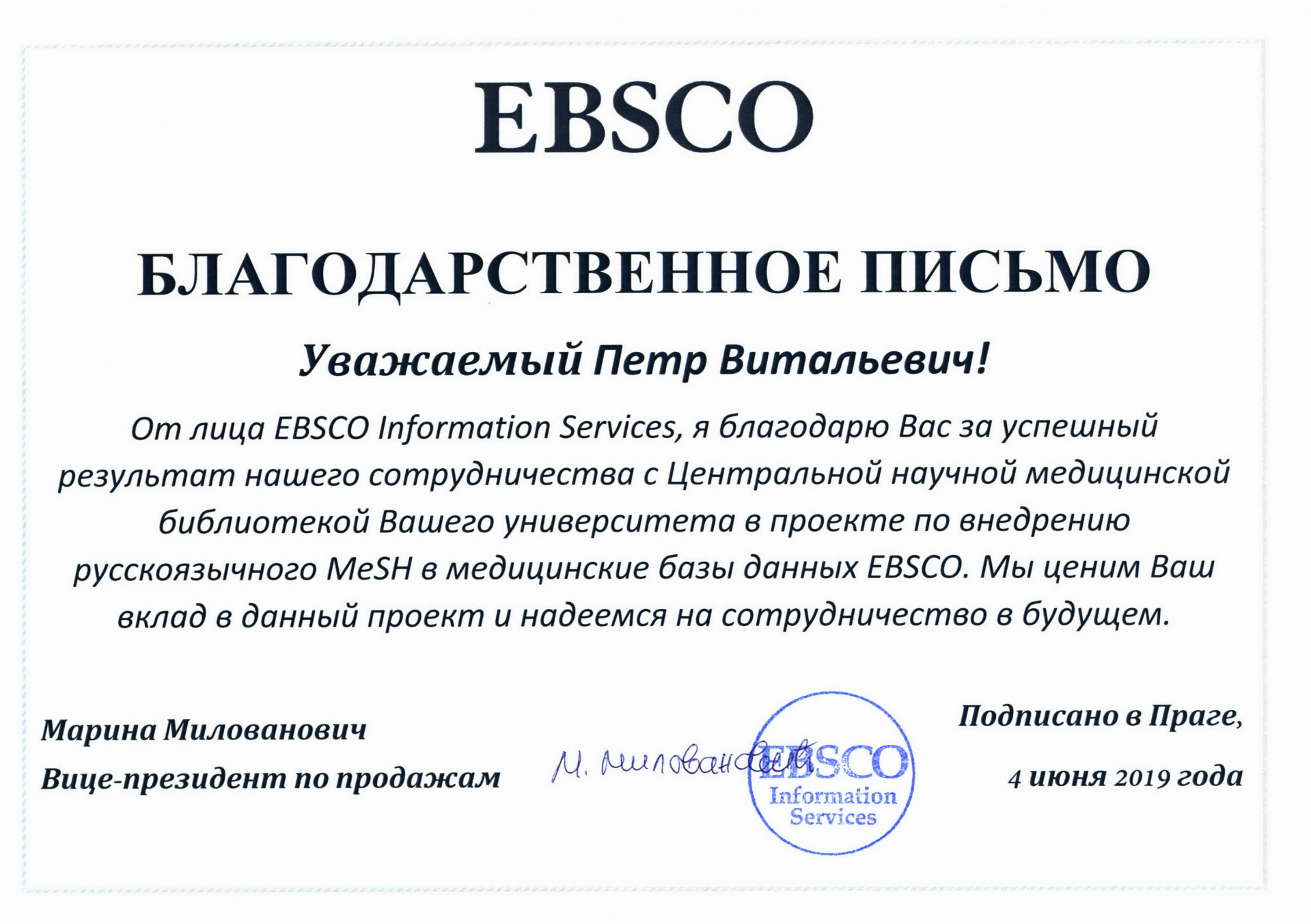 Центральная научная медицинская библиотека Сеченовского Университета разработала национальную русскую версию тезауруса для индексирования отечественной литературы и предоставления доступа русскоязычным пользователям к международным базам. В этой связи, в адрес ректора Петра Глыбочко поступило благодарственное письмо от руководства EBSCO за внедрение русскоязычного информационно-поискового языка MeSH в международные медицинские базы, включая Medline.