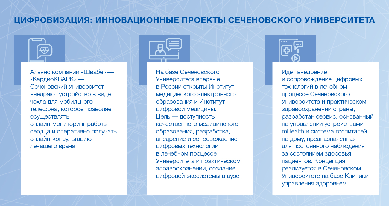 – Безусловно. Это колоссальный опыт, обмен мнениями, подтверждение того, что мы выбрали правильную стратегию. Стратегия универсальна и может быть внедрена в других вузах. Суть в том, что для достижения целей цифровой трансформации необходимо здоровое мышление каждого сотрудника, здоровое мышление в составе групп, формирование эффективных команд по каждому направлению организационной структуры. Если говорить о цифровизации медицины, здесь можно выделить три ключевых блока: социальный, клинический и биотехнологический, по каждому из них мы работаем.