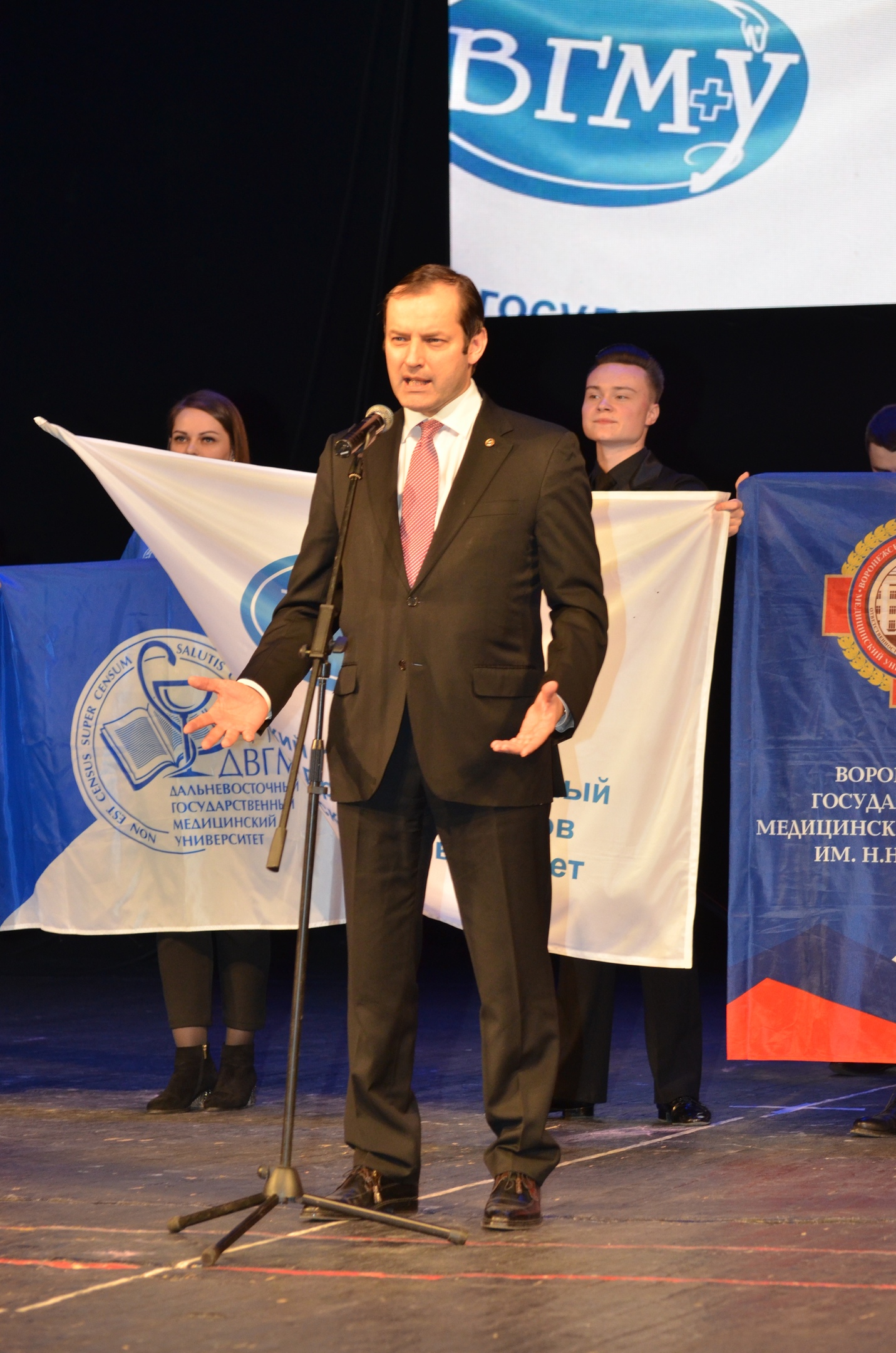 9 апреля 2019 г. в Смоленском государственном драматическом театре им. А.С. Грибоедова состоялось финальное событие XIV Всероссийского фестиваля искусств студентов-медиков - гала-концерт, награждение победителей и участников. Торжественное мероприятие началось с церемонии представления участников, которые вышли на сцену с флагами своих учебных заведений.
