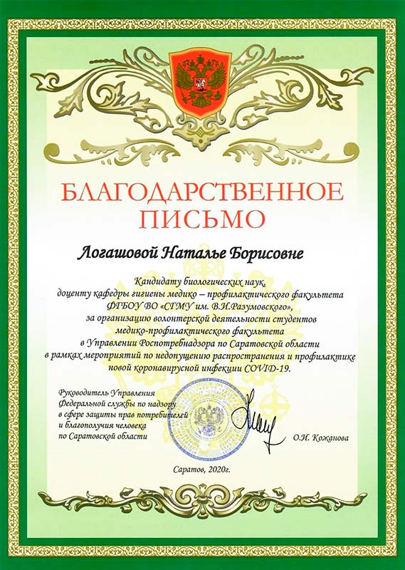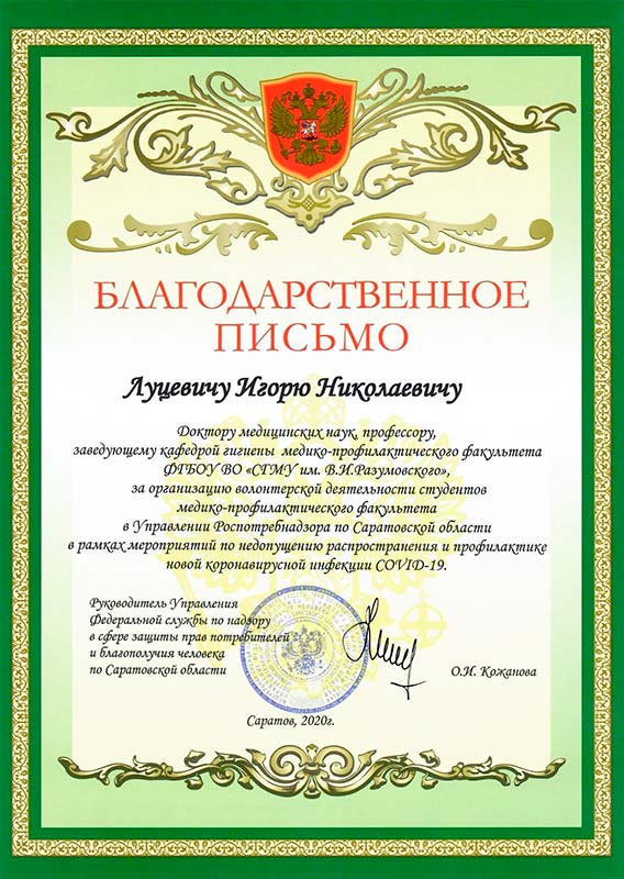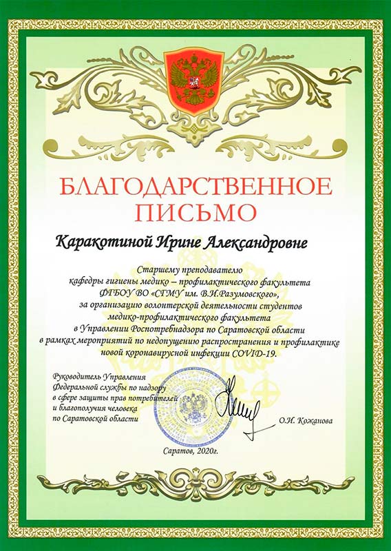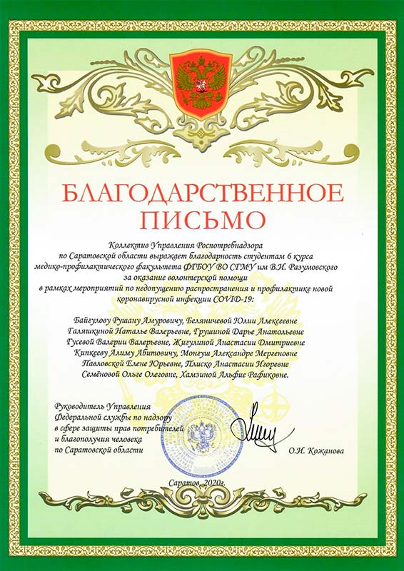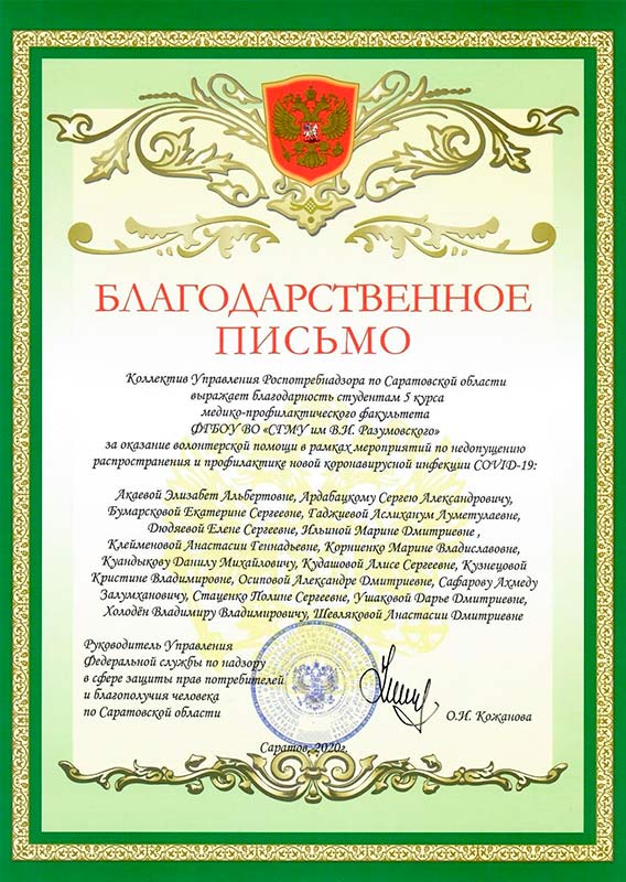 В адрес Саратовского медицинского университета им. В. И. Разумовского поступила благодарность Управления Роспотребнадзора по Саратовской области. Санитарные врачи благодарят ректора СГМУ Андрея Еремина, декана медико-профилактического факультета Дмитрия Суетенкова, заведующего кафедрой гигиены медико-профилактического факультета Игоря Луцевича и профессорско-педагогический состав кафедр медико-профилактического факультета за организацию волонтерской деятельности студентов 5-го и 6-го курсов для оказания помощи специалистам в мероприятиях, направленных на предотвращение распространения и профилактику новой коронавирусной инфекции.