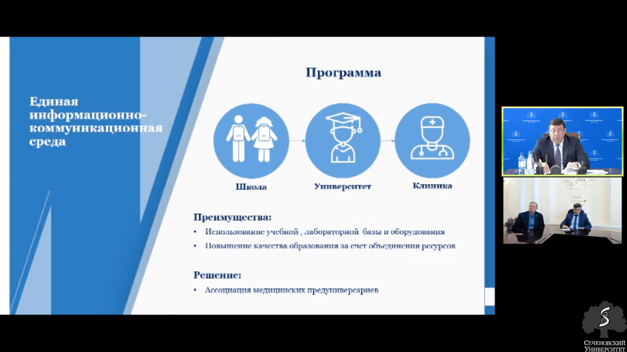 «Одна из ключевых целей – поиск и отбор талантов. Медицине требуются гибкие образовательные программы с новыми компетенциями, – убежден ректор Сеченовского Университета Петр Глыбочко. – Отличный пример таких программ – проект «Школа – Университет – Клиника», реализуемый Сеченовским Университетом, создание в вузе Институт электронного медицинского образования, развертывание на базе медицинских университетов консорциумов для формирования научных центров мирового уровня с участием молодых ученых». На пленарном заседании Петр Глыбочко представил стратегический доклад «Консорциумы – ключевой ориентир развития медицинского образования». По словам Петра Глыбочко, тема доклада не случайна – 2021 год объявлен в России Годом науки и технологий. На заседании Совета по науке и образованию Президент РФ Владимир Путин отметил, что «интеграция науки и образования должна оказать полное интеллектуальное содействие реализации национальных проектов, подготовить кадры для решения исследовательских и новых технологических задач».