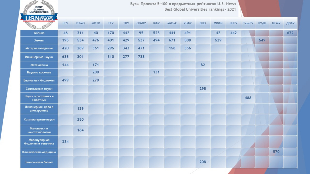 Значительная часть университетов Проекта 5-100 в этом году улучшила свои результаты в предметных рейтингах U.S. News Best Global Universities rankings. Национальный исследовательский ядерный университет «МИФИ» и Новосибирский национальный исследовательский государственный университет продвинулись вверх на 9 позиций в топ-100 предметного рейтинга «Физика», Московский физико-технический институт (национальный исследовательский университет) – на 13 позиций, обеспечив таким образом себе место в топ-50. Национальный исследовательский университет «Высшая школа экономики» впервые вошел в топ-100 в предметном рейтинге «Математика», заняв 82-ю позицию (+23 пункта), Санкт-Петербургский политехнический университет Петра Великого занял 95-ю позицию в предметном рейтинге «Физика» (+39 пунктов). Национальный исследовательский университет ИТМО поднялся на 139-ю позицию в предметном рейтинге «Инженерное дело в электронике» (+76 пунктов) среди сильнейших университетов в данном научном направлении. Также ИТМО вошел в топ-200 предметного рейтинга «Нанонауки и нанотехнологии» (164-я позиция). Помимо ИТМО в рейтинговом диапазоне 101-200 также представлены: