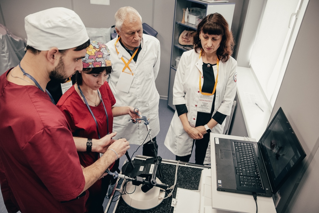 Установка Lap Mentor, применяемая в повседневной практике хирургических манипуляций, позволила студентам максимально приблизиться к реальным операционным условиям. Участники демонстрировали свое мастерство в операциях по сердечно-сосудистой, абдоминальной хирургии, урологии, травматологии и микрососудистой хирургии.