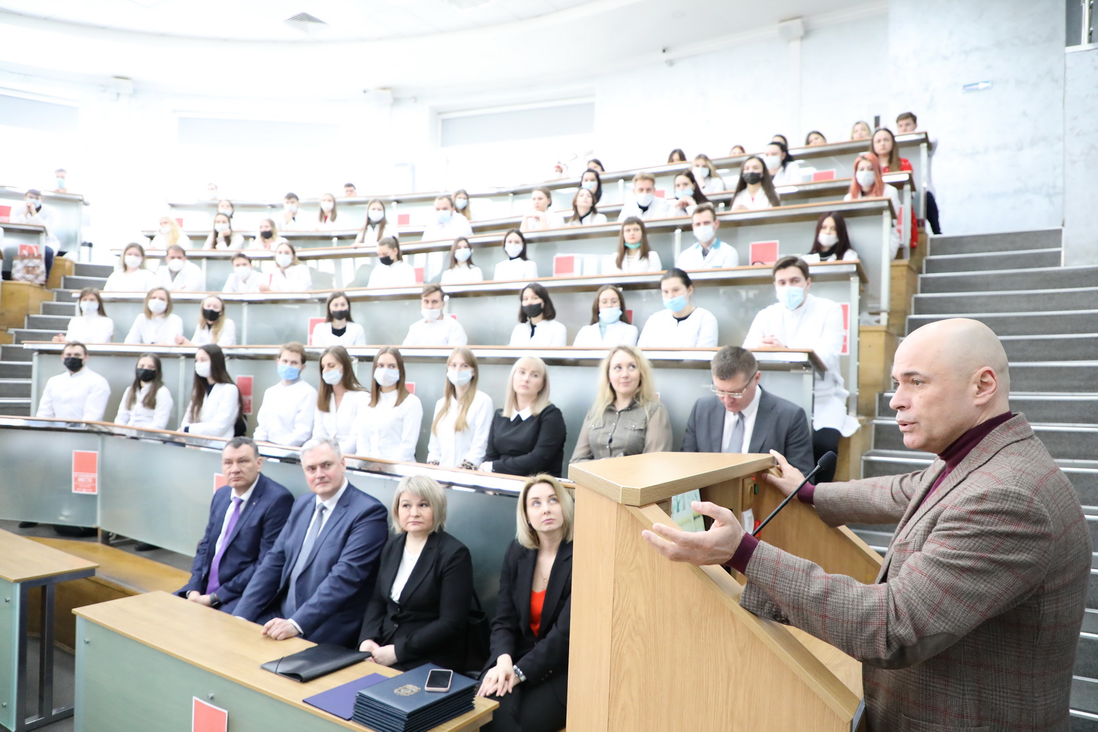 Так же Игорь Артамонов рассказал собравшимся в аудитории о комплексном взаимодействии с ВГМУ по решению проблемы обеспечения региона медицинскими кадрами и о том, что на базе Липецкой областной клинической больницы создана и успешно работает кафедра практической подготовки студентов-целевиков, обучающихся по программам специалитета и ординатуры в Воронежском медицинском университете. А также о том, что в школах региона в рамках Липецкого предуниверсария плодотворно работают девять медицинских классов.